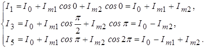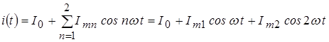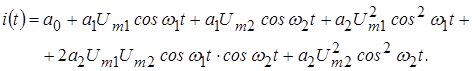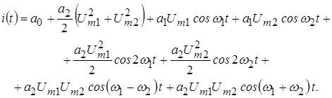 Анализ выражения (24) позволяет сделать вывод о значительном обогащении спектра тока по сравнению со спектром входного сигнала. В спектре выходного колебания, кроме слагаемых, имевшихся во входном сигнале – постоянной составляющей и гармоник на частотах ω 1 и ω 2 , возникли гармонические составляющие суммарной и разностной частоты (ω 1 + ω 2 ) и (ω 1 – ω 2 ), а также компоненты с удвоенными частотами 2ω 1 , 2ω 2 .