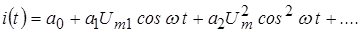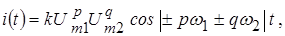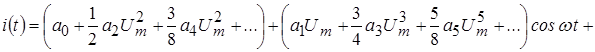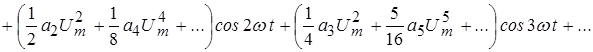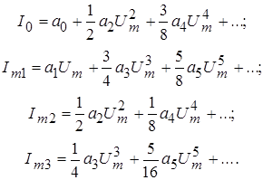 При увеличении порядка аппроксимирующего полинома проблема вычисления амплитуд спектральных составляющих сводится к громоздким выкладкам, приводить которые в данной лекции нецелесообразно. В самом общем случае, когда ВАХ представлена полиномом n -й степени, спектр тока через НЭ (в случае бигармонического воздействия) будет включать составляющие с частотами