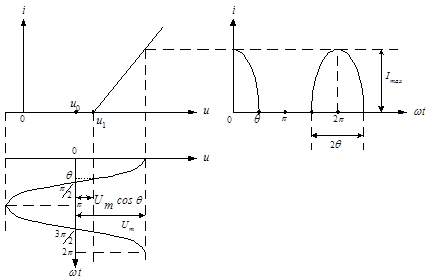 Участок на характеристике, где закон изменения тока близок к линейному, относительно неширок, поэтому амплитуда входного напряжения