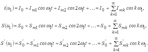 Если подставить все выражения (30) в (29) и выполнять элементарные (но очень громоздкие) преобразования, можно убедиться, что в спектре тока через НЭ будет присутствовать множество комбинационных составляющих, число которых не меньше, чем в (25). При этом амплитуды тока нелинейно будут зависеть от