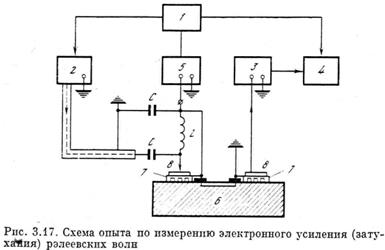 Коэффициенты усиления (затухания) измерялись в импульсном режиме на частоте ~ 30 МГц при длительности импульсов 2—3 мкс для рэлеевских волн и 1—2 мкс для поперечных волн. На рис. 3.17 приведена схема эксперимента. Дрейфовые электроды, служащие для создания в поверхностном слое кристалла постоянного электрического поля Е0 , наносились на плоскость ху путем напыления индия и представляли собой две параллельные полоски шириной 1,5 мм, находящиеся на расстоянии 7 мм друг от друга. Кристалл освещался ртутной лампой ДРШ-500, причем засвечивалась только узкая полоска (поверхностный слой 0.5 мм) между электродами. Остальная часть кристалла была закрыта непрозрачным экраном. Такое освещение позволяло локализовать электроны проводимости кристалла (созданные светом) в поверхностном слое между дрейфовыми электродами и этим достигнуть постоянства напряженности Е0 по координате х (в пределах 10%). Для развязки импульсов дрейфового поля п импульсов с частотой заполнения 30 МГц. подаваемых на излучатель через коаксиальный кабель, использовались индуктивность L и емкости С.