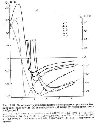 , где электронное поглощение звука также максимально. Такие зависимости наблюдаются в фотопроводящих полупроводниках, в которых значительные изменения проводимости происходят при изменении освещенности.