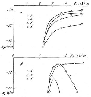 На рис. 3.18—3.21 приведены результаты измерений. а рис. 3.18 и 3.19 представлены кривые усиления рэлеевских (рис. 3.18, а, 3.19, а) и поперечных (рис. 3.18, б, 3.19, б) волн в образцах 1, 2 соответственно. По осям абсцисс отложена напряженность дрейфового поля в кристалле в киловольтах, по осям ординат — коэффициенты усиления (затухания) в дБ/см. Длина пути в кристалле, на которой происходило усиление рэлеевских волн, составляла 7мм, для поперечных волн эта длина равнялась 11.5 мм (образец 1) и 9,4 мм (образец 2). Каждая кривая на рисунках соответствует определенному значению электропроводности а кристалла. Области значений s выбирались с таким расчетом, чтобы получить максимальные на данной частоте значения коэффициентов усиления волн в кристалле. На каждом из рисунков имеется по две теоретических кривых, соответствующих граничным (максимальному и минимальному) значениям электропроводности образца (рис. 3.20, а, 3.21, а — опыты с рэлеевскими волнами, рис. электропроводности для данного типа волн в данном образце. Эти кривые нанесены тонкими сплошными линиями (чтобы не увеличивать существенно размер рисунка, масштаб изменения отложен для них на правых осях ординат). На рис. 3.20 и 3.21 изображены кривые усиления шума в образцах 1 и 2 соответственно при различных значениях 3.20, б, 3.21, б — опыты с поперечными волнами). Под шумом здесь понимаются тепловые колебания решетки кристалла, усиленные дрейфовым полем (волны Дебая). Естественно, что шумы измерялись в полосе пропускания схемы (28—32 МГц).
