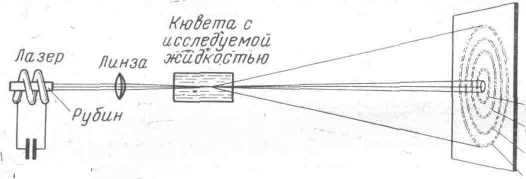 установленном перпендикулярно к направлению падающего луча, виден яркий цветной круг. Опыт показывает, что если кювету с жидкостью, например нитробензолом, поместить между сферическими зеркалами резонатора Фабри—Перо рубинового лазера, то стоксово рассеяние будет иметь место в инфракрасной области. Для распространения его не характерно какое-либо определенное направление; в основном это направление падающего луча, тогда как антистоксово рассеяние образует ряд световых конусов с цветовой гаммой, от красного до голубого. Ближайший из них соответствует частоте