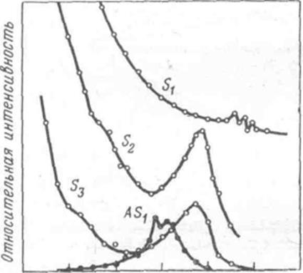 Антистоксова линия 635 мм к (кривая AS 1 ), стоксовы линии: 765 ммк (кривая S 2 ), 853 ммк (кривая S 2 ), 964 ммк (кривая S 3 ).