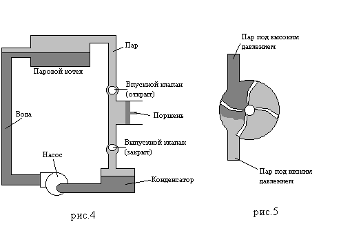 Для практической работы любого теплового двигателя необходима разность температур. Почему? Что бы ответить на этот вопрос представим себе паровую машину (как на рис.4), но без конденсатора и насоса. В таком случае пар имел бы одинаковую температуру во всей системе. Это означало бы, что давление пара при его выпуске было бы таким же, как и при впуске. Тогда работа, которую совершил пар над поршнем при своем расширении, в точности была бы равна работе, которую совершил поршень над паром при его выпуске, то есть не было бы совершено никакой результирующей работы. В реальном двигателе выпускаемый газ охлаждается до более низкой температуры и конденсируется, так что давление при выпуске меньше, чем при впуске. В таком случае работа, которую должен совершить поршень для выталкивания газа из цилиндра, будет меньше, чем работа совершаемая газом работа над цилиндром. Таким образом может быт получена результирующая работа. Аналогично и с паровой турбиной: если бы не было разности давлений по обе стороны лопаток, то турбина не стала бы вращаться.