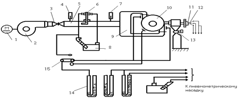 Отбор статистического давления во входных каналах и на боковой поверхности модели осуществляется через дренажные отверстия диаметром 0,7 мм. В качестве измерительного прибора используется дифференциальный водяной манометр 14, соединяемый с соответствующими точками отбора давления переключателем 15.