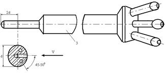 Трехканальные цилиндрические зонды применяются для исследования практически плоского потока. Приближенно циклонный поток в пределах его ядра можно рассматривать как плоский. Насадок 3 имеет три отверстия диаметром 0,3–0,4 мм, находящиеся на его боковой поверхности в одной плоскости, перпендикулярной оси зонда, на определенном (не менее 2d) расстоянии от торца. Боковые отверстия по отношению к центральному располагаются симметрично, причем угол между их осями должен составлять