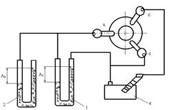 По дифференциальному водяному манометру 1 (рисунок 4) отсчитывают перепад давления А1 между центральным и одним из боковых отверстий, пропорциональный напору в данной точке потока, а по дифманометру 2 (рисунок 4) – полный напор А2 . Угол скоса поток φ определяют по лимбу координатника с ценой деления 10. Полученные данные позволяют определить полную скорость потока и ее тангенциальную (вращательную) и осевую составляющие, а так же статическое давление.