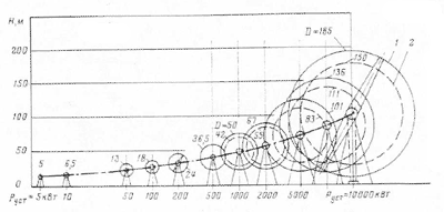 Из рисунка 8 видно, как установленная мощность Руст, развиваемая ветроколесом с горизонтальной осью вращения, зависит от его размеров.