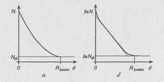 Результаты измерения наносят на полулогарифмический график. По оси абсцисс наносят толщину слоя, а по оси ординат – логарифмы интенсивности излучения. В случае изотопа с простым бета – спектром (бета – частицы имеющие одну максимальную энергию) и испускающего еще и гамма – излучение получается кривая, показанная на рис. 5.1. Практический пробег R находится путем экстраполирования кривой поглощения к уровню фона от гамма – излучения, или применяют метод сравнения Физера, который позволяет определить пробег в каком – либо веществе путем сравнения кривой поглощения в этом веществе с кривой поглощения в веществе с известным пробегом.