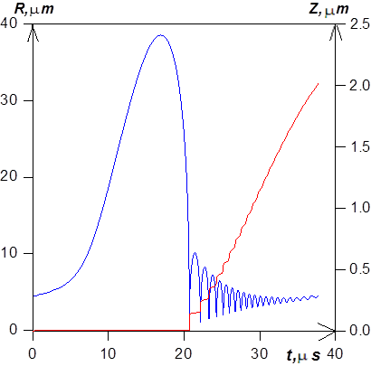 | Рис.1. Изменение радиуса пузырька и положения его центра во времени. |