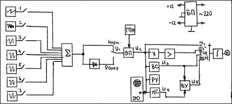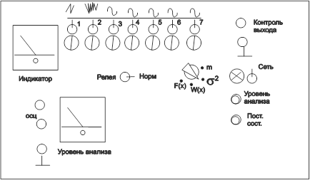 - сім джерел незалежних випадкових сигналів (одного шумового з нормальним розподілом, одного трикутного і п'ять гармонійних). Дисперсія випадкових сигналів регулюється відповідними потенціометрами ;