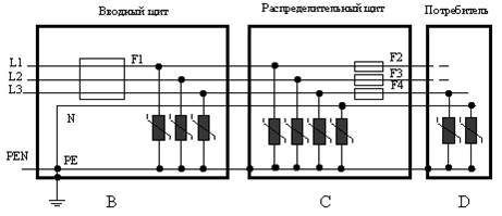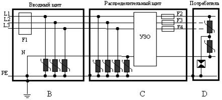 Для забезпечення максимального ступеня захисту від перенапружень застосовують комбіновані системи з декількома ступенями захисту умовно що позначаються А, В, С, і D.