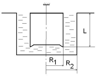 Ротаційний віскозиметр - це прилад, основу якого покладено два вертикально розміщених коаксіальних циліндри (рис.1). Один із циліндрів, як правило, зовнішній, може обертатися з певними швидкостями. Рідина, що випробовується, заливається в зазор між циліндрами. Щілини між цими поверхнями по можливості повинні бути досить малими для забезпечення сприятливих умов теплообміну між металевими поверхнями, що утворюють щілину, та матеріалом, який в ній знаходиться. Основні закономірності течії в’язкої рідини між двома коаксіальними циліндрами знайдені М.Маргулесом. При обертанні зовнішнього циліндра із заданою кутовою швидкістю ω2 через рідину, що знаходиться в зазорі, передається момент М, який може бути виміряним. Припускаємо, що торці циліндрів суттєво не впливають на течію в зазорі.