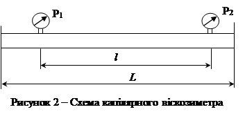 Основою капілярного віскозиметра є трубка з внутрішнім діаметром d (рис. 2). По трубці пропускається досліджувана рідина з відомою витратою Q. На робочій дільниці трубки вимірюється перепад тиску Δp = p1 – p2 . Робоча дільниця повинна знаходитись на певній відстані від кінців, щоб виключити їх вплив. За звичай загальна довжина трубки L > 100d. Робоча дільниця l повинна знаходитись на такій відстані від кінців, щоб на ній виконувалась умова