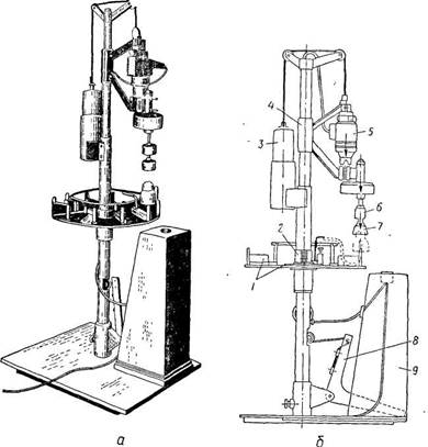 а — загальний вигляд: б — будова; 1 — поворотний стіл з дванадцятьма гніздами для встановлення в них гачків; 2 — фіксатор; 3 — противага: 4 — рухома каретка;