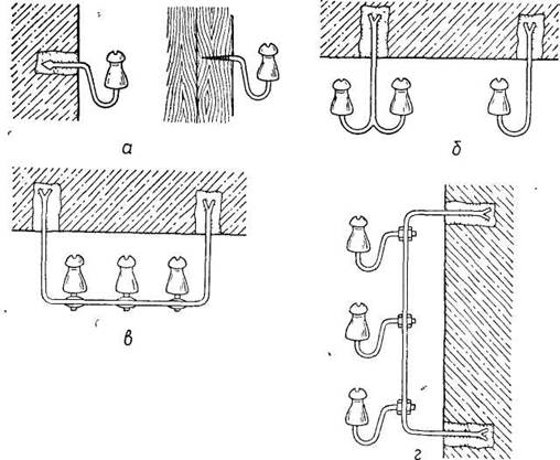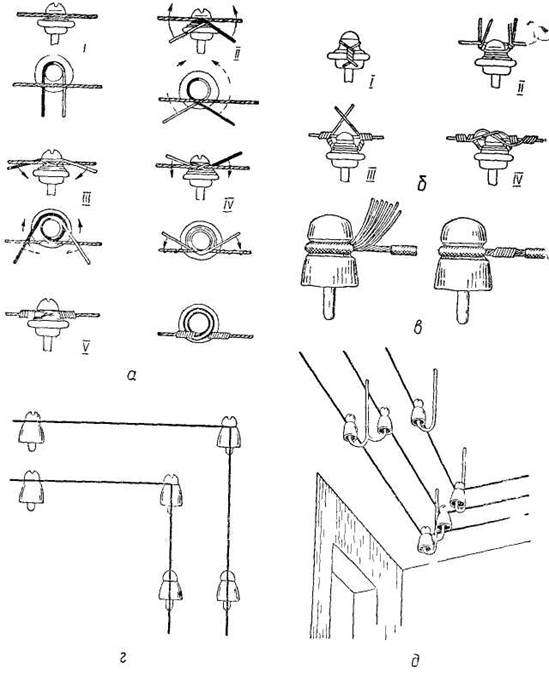 Монтаж проводів починають з розкладання заготовленої проводки вздовж траси з таким розрахунком, щоб відгалуження до світильників, вимикачів і штепсельних розеток розмістилися на ізоляторах. Далі накидають проводи на ізолятори, закріплюють на початку ділянки проводки і, натягнувши вручну або поліспастом, кріплять їх до головок і шийок ізоляторів оцинкованим дротом 0,8—І мм, попередньо намотавши на проводи 2—3 шари ізоляційної стрічки для запобігання пошкодженню його ізоляції (прорізанню) в'язальним дротом. На прямих ділянках проводки проводи кріплять на шийках або головках ізоляторів, а на поворотах і в місцях зміни напрямку проводки — лише на шийках або петлею-заглушкою. При перетинах проводів один з них у місці перетину вміщують в ізоляційну трубку.