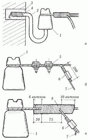 а — на шийці ізолятора, б — на головці ізолятора, в — петля-заглушка,