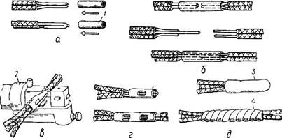 а - підготовка проводів до однобічного опресовування, б — те саме, для двобічного опресування, в — момент опресовування кліщами ГКМ, г — опресовані з'єднання д —готові з'єднання, 1 — гільза ГАО, 2 — кліщі ГКМ, 3 — пластмасовий ковпачок, 4 — липка вінілхлоридна стрічка