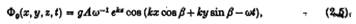 Відповідно до припущень про лінійну теорію водної хвилі, ми можемо скласти потенціал швидкості Ф(x, y, z, t) для задоволення задачі: