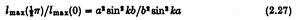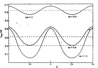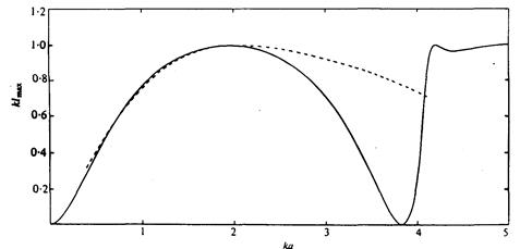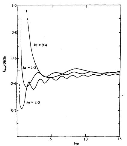 На рис. 4 показана зміна klmax з ka в той час, як рис. 5 показує безрозмірну зміну ширини захвата щодо діаметру диска. Можна побачити, що максимальне значення klmаx відбувається в першому нулі поки klmах зменшується до нуля при ka = 3,83 відповідно до першого нуля B (ka). Наступні нулі А(ka), B (ka) викликають коливальну поведінку klmax зі збільшенням ka. Найкраще це показано при відношенні ширини захвата lmax/2a зі зміною ka. Ефект позначення, який включає А (ka) дає абсолютний максимум відношення ширини захвата приблизно 0,4 у потрібному діапазоні при ka == 0,7 або відношення довжини хвилі до діаметра приблизно 5. Також показана крива (2ka) -l отримана з (2.24), приймаючи, що резонанс може бути досягнутий при всіх частотах. Як очікується єдина точка контакту з кривою lmax/2a знаходиться в першому нулі А(ka).