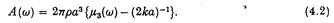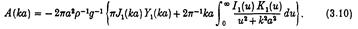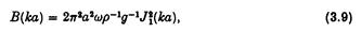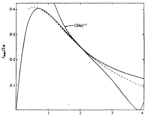 Граф виразу в фігурних дужках в (3.10) показаний на рис. 3 проти ka. Здається, що А(ka) має тільки сім нулів, перший з яких є ka = 1,96 відповідно до радіуса диску приблизно три десятки довжини хвилі. Перший нуль B (ka) відбувається в ka = 3,83.
