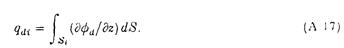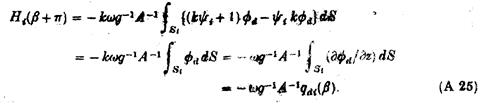 З цього випливає, що всі результати, які зв’язують властивості вимушеного руху твердого тіла в даному способі (Ньюман 1976), або ряд незалежно коливающихся твердих тіл (Срокоз 1979), відповідають задачі дифракційного розсіювання області набігаючої хвилі таким тілом або тілами, мають аналогію в поверхневих розподілах тиску. Відповідність буде, якщо тверді тіла прийняті як тонкі горизонтальні пластини, які роблять одиничні вертикальні коливання у вільній поверхні. Хоча вимагається, щоб к дорівнювало нулю в (А11) у цьому випадку, це не торкається результатів, які отримані за допомогою теореми Гріна. Відповідність завершується відзначенням, що вертикальна захоплююча сила на Sі, тільки iwpk-1qdi, тобто пропорційна об’єму потоку через Sі.