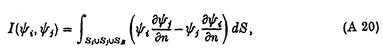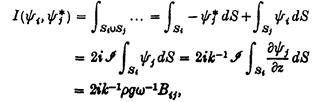 де інтегрування по і-й та j-й внутрішній вільній поверхні, а також по твердій границі SB. Тепер поверхня інтегрування (А20) може бути закрита більшим, вертикальним круглим циліндром Sc, який охоплює всі вільні поверхні та тверді границі і тягнеться від вільної поверхні вниз. Починаючи з y і , y j поведінка подібна убігаючій хвилі на більших відстанях, не дає додаткового внеску в (А20), отримується з інтегралу по Sc. Також, немає внеску від інтегралу по SF або по Sk, k = 1, ..., N, k ¹і, k ¹ j. Отже з (А19) витікає, що: