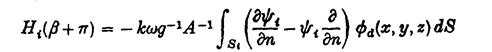Показує, що цьому у двовимірній області також вимушений потік через Sі за допомогою набігаючої та дифрагованої області пропорційний амплітуді випромінюваного потенціалу в далекій області в напрямку, в якому прибуває набігаюча хвиля. В (А34) qdi – об’єм потоку в одиниці ширини поверхневого тиску. Подальші відношення між властивостями рішення yі задачі потужності випромінювання та фd, рішенням дифракційної задачі в і дво- та тривимірних областях також можна отримати використанням функцій Коші та теореми Гріна. Зокрема, нові відношення, доведені Ньманом (1976), рівняння (48), (49)), переносяться на розподіли тиску без змін. Вони не подані тут, оскільки метод доведенняу ідентичний і вони не є необхідними в існуючому контексті.