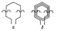 а і б - при виведених на корпус трьох кінцях обмоток; в - при виведених на корпус шести кінцях обмоток