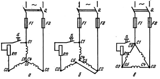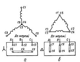 Сукупність секцій, які належать до однієї фази, називається фазною обмоткою. Виводи фаз обмотки прийнято позначати: С1, С2, С3 — початки і С4, С5, С6 — кінці відповідно першої, другої і третьої фаз. Окремі фази обмотки статора можуть з'єднуватися зіркою або трикутником. На рис. 1.3 наведено схеми з'єднання фаз обмотки статора і відповідні цим з'єднанням перемикання на щитку машини.