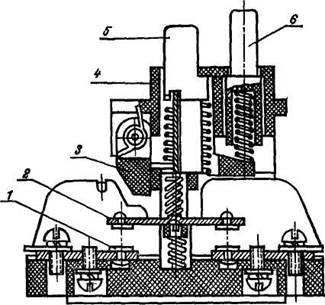 1 - нерухомі контакти; 2 - рухомі мостикові контакти; 3 - защелка; 4 - корпус; 5 - кнопка «Пуск»; 6 - кнопка «Стоп»