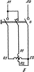 У пускачах серії ПНВС, призначених для управління однофазними двигунами, середній мостиковий контакт замикається лише при натиснутій кнопці і не фіксується в замкнутому положенні. При повертанні кнопки «пуск» в початкове положення (після натиснення) він розмикається і відключає пускову обмотку однофазного електродвигуна (Рис. 2. 2 б).