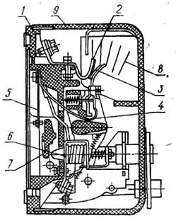 1 - нагревач; 2 - біметалічна пластинка; 3 - температурний компенсатор; 4 - ексцентриковий регулятор; 5 - важіль; 6 - клямка механізму; 7 - кнопка ручного повернення; 8 - рухомий мостиковий контакт; 9 - нерухомий контакт