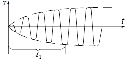 Через деякий час t1 , завдяки дії вимушеної сили F0 , амплітуда коливань досягне максимального значення (рис. 1). З цього моменту часу розв’язком рівняння (2) буде лише функція