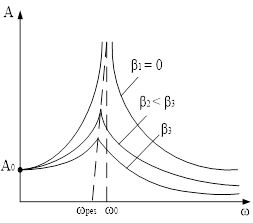 На рис. 3 наведені залежності амплітуди вимушених коливань від частоти при різних значеннях β. З виразів (15) і (16) випливає, що чим менше β, тим вище і правіше лежить максимум даної кривої. Якщо