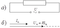1. Розглянемо ланцюг, в який ввімкнули лише резистор R , а індуктивність L і ємність С ─ відсутні (рис.5,а).