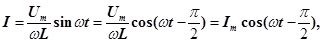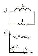 2. Розглянемо випадок, коли змінний струм тече через котушку індуктивності L, в цьому випадку резистор R і ємність С в ланцюзі відсутні (рис. 6,а ).