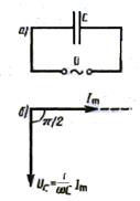 3. Нехай змінний струм в ланцюзі тече через конденсатор ємністю С, в цьому випадку активний опір R і котушка індуктивності L відсутні. (рис. 7,а ).