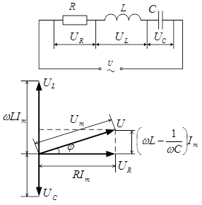 Розглянемо ланцюг змінного струму, що містить послідовно ввімкнуті резистор, котушку індуктивності і конденсатор. На рис. 8, а показаний ланцюг, що містить резистор опором R, котушку індуктивністю L і конденсатор ємністю С, на кінці якого подається змінна напруга (19).