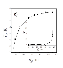 = 8 нм. На том же рисунке белыми квадратами обозначена теоретическая зависимость Tc