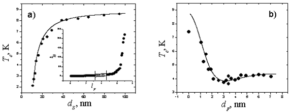 Рисунок 2. Зависимости Tc (dS ) (a) и Tc (dF ) (b) для бислойных S/F структур.