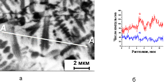 Рис.3 Микрофотография дендритной структуры (а) и распределения интенсивностей характеристических рентгеновских излучений кремния и никеля вдоль линии АА (б) системы Ni/Si(100), обработанной одним импульсом при плотности энергии потока 8 Дж/см2
