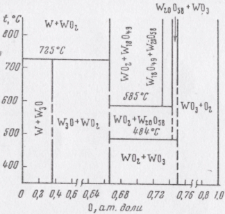 При исследовании сплавов системы вольфрам—кислород было показано, что в структуре этих сплавов обнаружена только смесь чистого вольфрама и WO2 , при этом было установлено, что параметр решетки вольфрама в пределах точности измерения сохраняется постоянным при всех концентрациях кислорода. [5] Предельная растворимость кислорода в вольфраме при 1700o С равна 0,06% ат. (0,005% вес.)