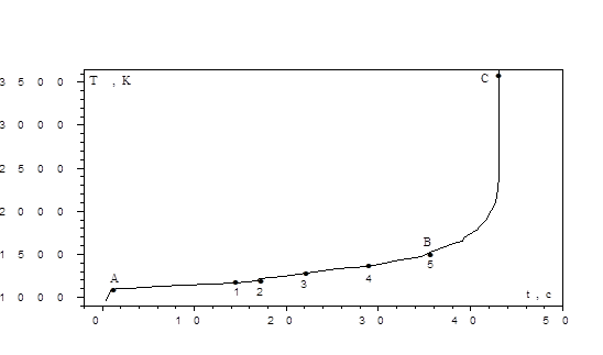 Кривая до т.i определяет низкотемпературные устойчивые стационарные режимы – окисление, кривая после т.e – устойчивые высокотемпературные режимы - горение. При повышении силы тока в низкотемпературном режиме происходит монотонный рост температуры проволочки, приводящей к возникновению на поверхности проволочки химической реакции окисления.