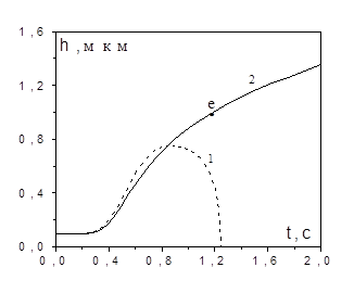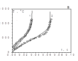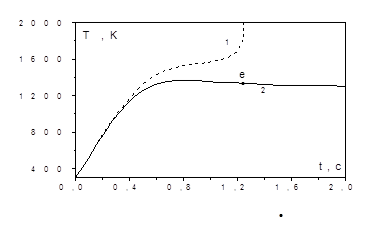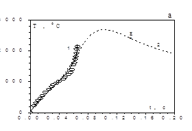 Дифференциальные уравнения (2.13), (2.14) с учетом уравнений (2.9), (2.5)–(2.12) описывают нестационарный высокотемпературный тепломассообмен и кинетику окисления вольфрамового проводника, нагреваемого электрическим током в газообразной среде, с учетом испарения окисла с его поверхности. На рис.2.3 представлены зависимости T(t) и h(t), рассчитанные по указанным формулам для вольфрамового проводника, нагреваемого электрическим током в среде кислорода. Результаты представлены в сравнении с экспериментальными данными А. Г. Мержанова [10]. Кривая 2 описывает зависимости T(t) и h(t) без учета теплопотерь на испарение. Высокотемпературное состояние характеризуется максимальным значением температуры, которая затем уменьшается по мере роста толщины оксидного слоя. При достижении толщиной окисла критического значения hE происходит затухание реакции окисления на поверхности проводника, вследствие уменьшения плотности химического выделения. С учетом испарения оксида с поверхности проводника толщина оксидной пленки увеличивается (кривая 1), достигает максимального значения, а затем убывает, т.к. скорость испарения ее при высоких температурах больше скорости образования окисла. Результаты расчетов по физико–математической модели с учетом испарения хорошо согласуются с экспериментальными данными. С уменьшением мощности электрического тока, нагревающего проводник, увеличивается время высокотемпературного окисления проводника и максимальное значение толщины оксидной пленки, т.к. при более низких температурах скорость испарения окисла меньше.