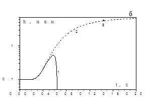 а) h0 =0.4 мкм; 1 – без учета испарения, 2 – с учетом испарения WO2 ;