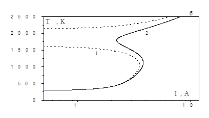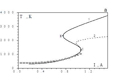 Кружочками на рис.3.1 представлены экспериментальные данные, полученные нами для вольфрамовой проволочки тех же геометрических размеров. Наблюдается хорошее согласие экспериментальных и расчетных стационарных низкотемпературных режимов тепломассообмена. Определено критическое значение силы тока, при котором происходит скачкообразный переход в высокотемпературное состояние проводника. При достижении силой тока критического значения Ii