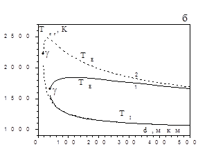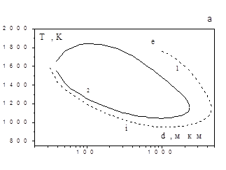 На рис.3.2 представлены критические значения силы тока и температур вольфрамового проводника, при которых происходит его зажигание и потухание в зависимости от диаметра и толщины окисла на поверхности. Учет теплопотерь на испарение оксидной пленки приводит к повышению критических значений силы тока, при которых реализуются высокотемпературные состояния. При некотором малом диаметре проводника